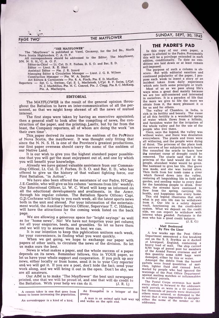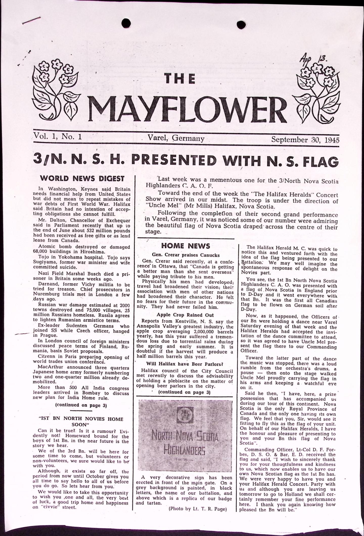 A copy of The Mayflower, the Nova Scotia Highlanders newspaper, Vol.1, No.1. Dated September 30th, 1945. Share this: Click to share on X (Opens in new window) X Click to share on Facebook (Opens in new window) Facebook Like Loading... Related
