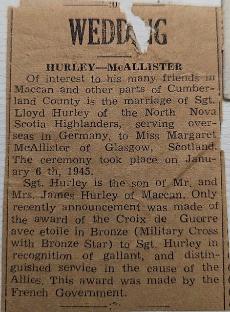 Margaret met Sgt. Llyod Hurley of the North Nova Scotia Highlanders while he was posted in England and Scotland during World War II. They ended up getting married without permission on January 6th, 1945. Sgt. Hurley had a furlough and went to Scotland to see Marg, while he was there, they married. When Lloyd Hurley returned to camp, he asked his friend Colin Nelson where the army Padre (military chaplain) was. Colin said, “what do you need the Padre for?” Sgt. Hurley responded, “I got married while in Scotland and now I need to get permission.”